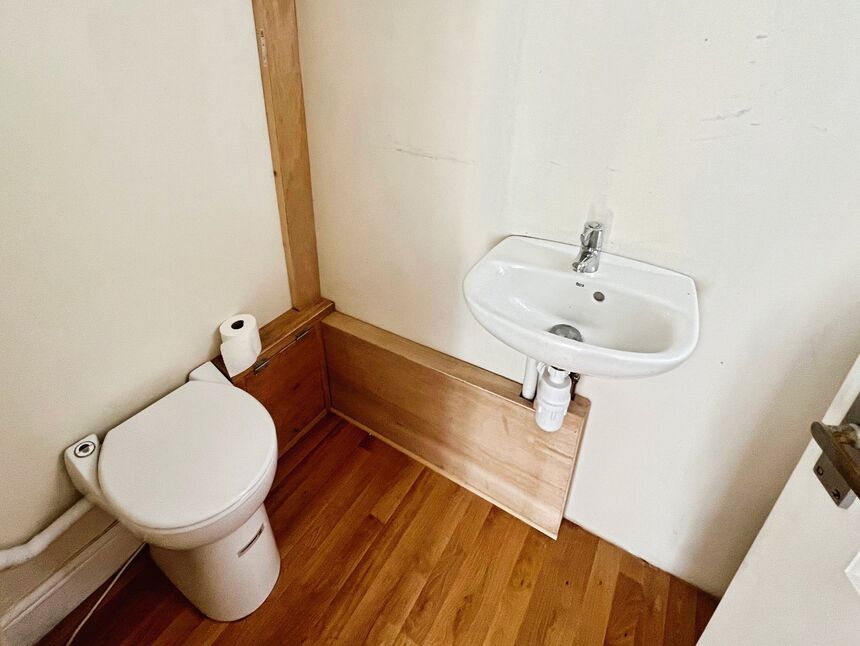 The lounge is a particularly impressive feature of the home, boasting a vaulted ceiling with exposed beams that add character. Both bedrooms are doubles offering plenty of natural light. The contemporary bathroom is well-appointed with modern fittings while a separate second WC adds further convenience.