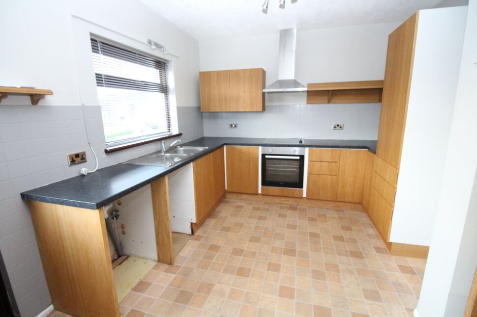 Range of fitted high and low level units. One and a half bowl stainless steel sink unit with mixer tap. Part tiled walls. Built in hob and oven.