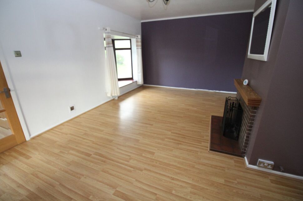 Brick surround fireplace with tiled hearth incorporating an open fire. Laminate wooden floor. Bay window.