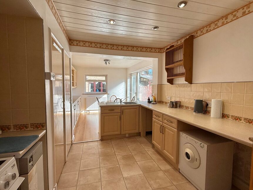 The open plan kitchen/dining room benefits from fitted cabinetry, space for appliances, and room for a dining table. A door leads directly to the back garden, making this a practical and sociable space for family life or hosting.