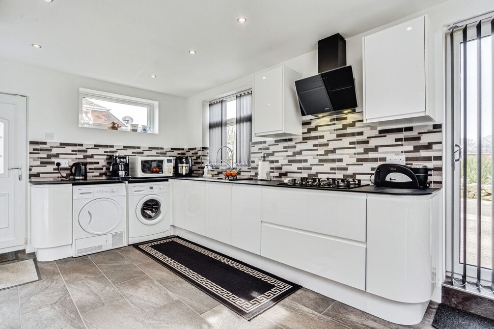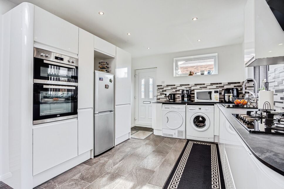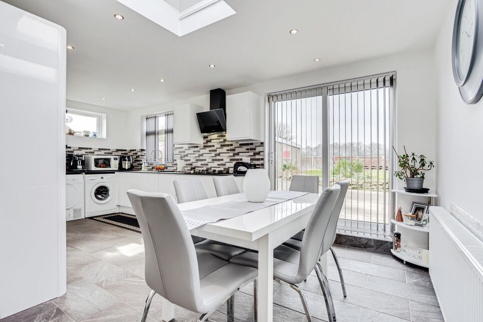 Bespoke fitted kitchen comprising of wall and base units with slimline worktops and integrated sink/drainer. With integrated appliances such as double oven, 5 stove gas hob with cooker hood over and integrated dishwasher. There is plumbing and space for other kitchen appliances. This room has a side entrance door, Patio doors out into the rear garden, uPVC double glazed windows to the side and rear elevations with two sky light windows to the ceiling. Tiling to walls and floor.