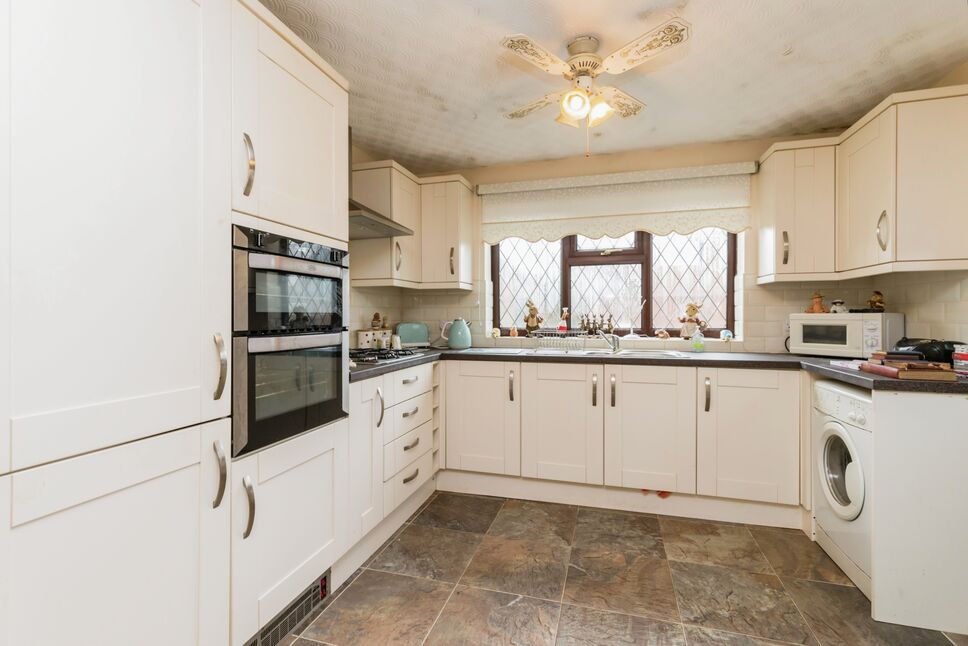 Extended kitchen diner providing space for a table and chairs. The kitchen benefits from a good range of wall and base units with contrasting work surfaces incorporating one and a half bowl sink and drainer, double oven and gas hob. Space for a washing machine and fridge freezer. Part tiled walls. Radiator and ceiling light point. Door leading out to the rear garden.