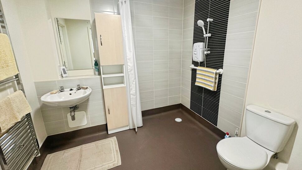 Modern jack & jill style wetroom with, w/c and hand was basin. door leading from hallway & bedroom one.