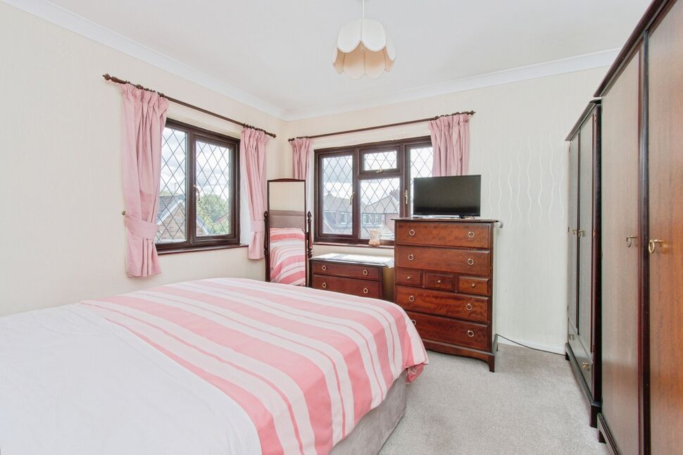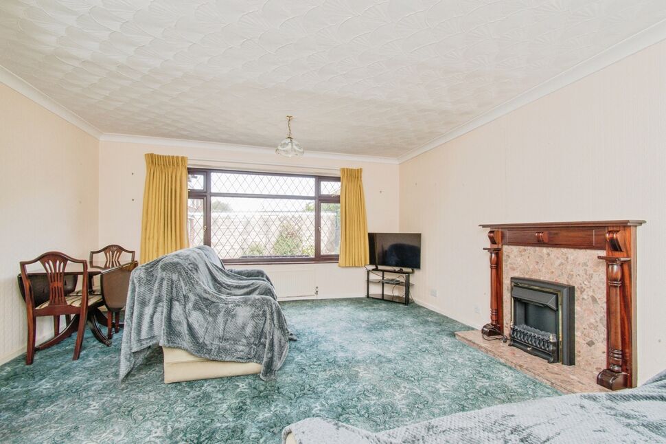 A feature fire surround with an electric fire inset, a central heating radiator, a window overlooks the rear garden and a bay window overlooks the front. A door leads to the kitchen.