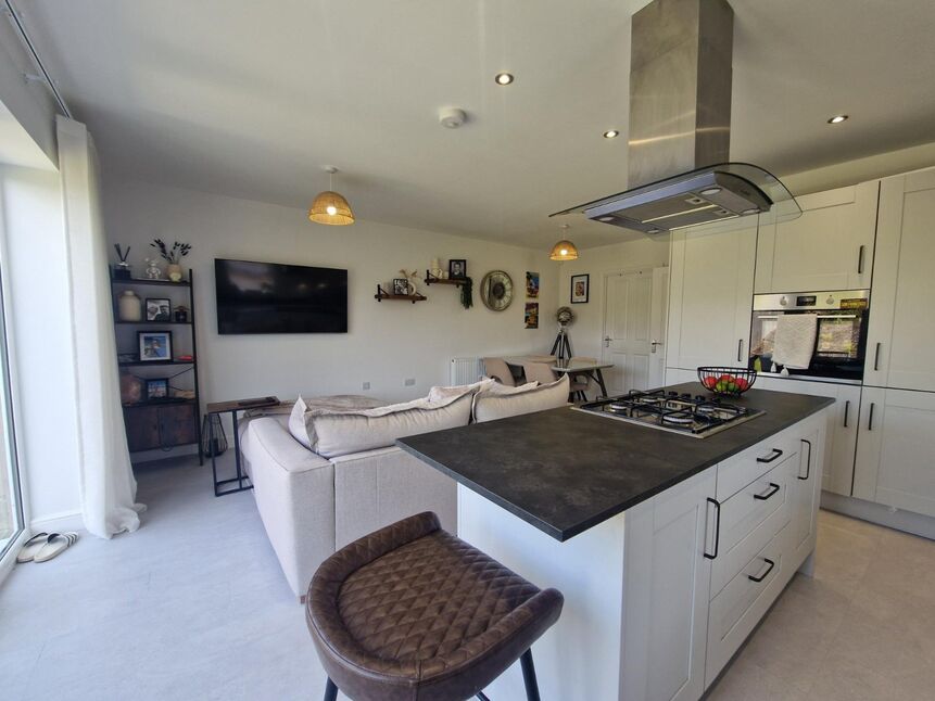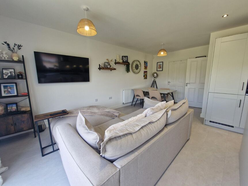 The heart of the home is a spacious open-plan kitchen and dining area, thoughtfully designed with a sleek central island that’s perfect for entertaining or enjoying casual meals. A separate utility area adds practical storage and convenience, complementing the contemporary layout. Both bedrooms are generously sized doubles, offering plenty of natural light and comfort. The modern family bathroom is well appointed and finished to a high specification, in keeping with the rest of the property’s immaculate interiors.