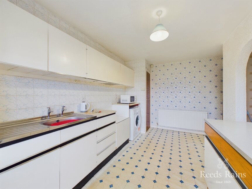 Overlooking the rear garden, the kitchen features a double-glazed window and an external door for direct garden access. Well-fitted but in need of modernisation, it includes a range of base and wall-mounted cabinets with cupboards, drawers, laminated work surfaces, and ceramic splash-back tiling. A stainless steel sink unit and radiator complete the space. An open archway leads to the dining room.