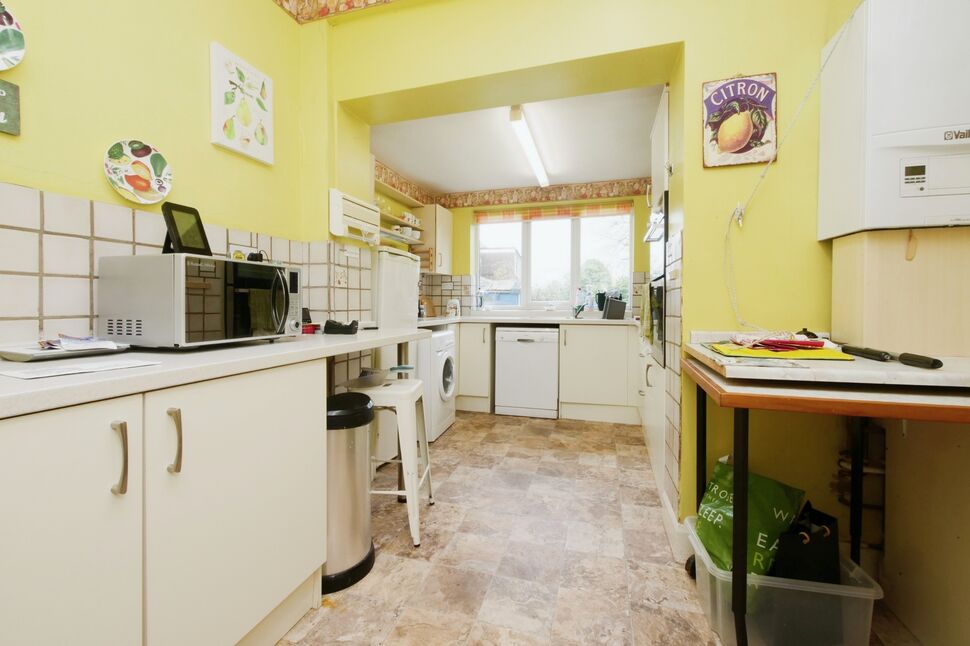 Fitted with a range of wall and base units, matching preparation works surfaces, integrated oven and gas hob, double glazed window to the rear aspect and central heating radiator.