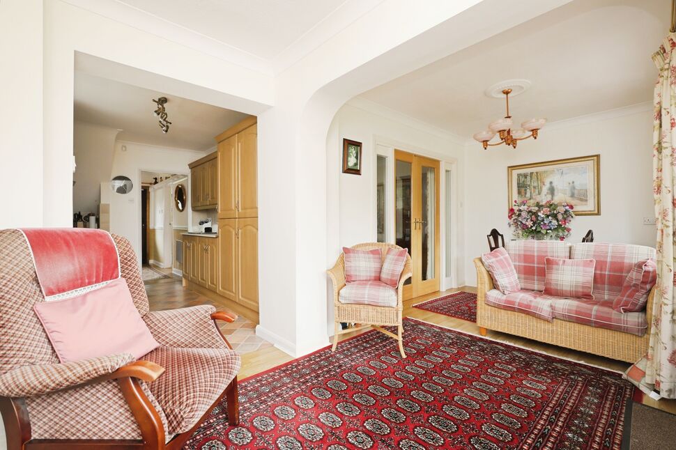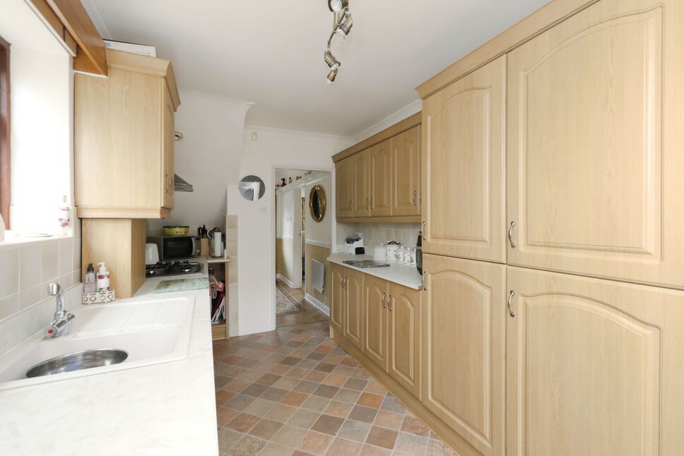 Open plan with the kitchen having laminate floor covering, two rear facing double glazed windows, central heating radiator and rear facing double glazed door providing access to the garden.