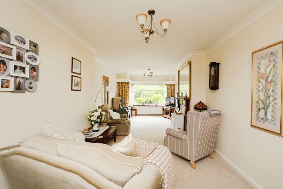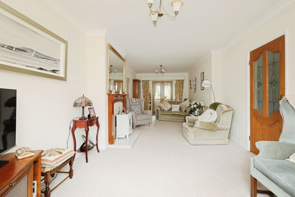 A spacious lounge with fitted carpet, central heating radiator, electric feature fireplace, front facing double glazed bay window and double doors leading into the dining room.