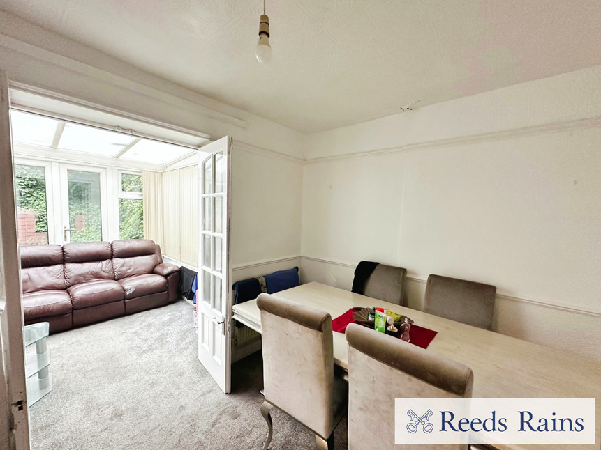 Separate room from the living room and leads onto the kitchen and conservatory. Carpet flooring and radiator.