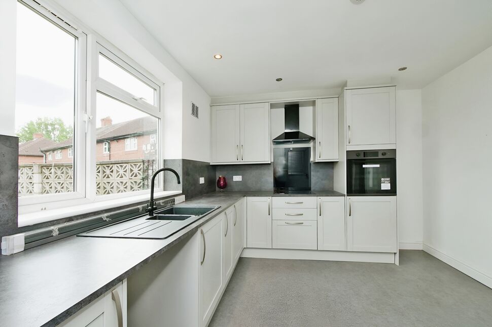 A newly fitted kitchen with a range of stylish wall and base units, topped with contrasting work surfaces with sink and drainer inset. Double glazed window to the rear aspect and internal door to pantry area with plumbing for a washing machine.