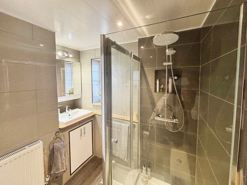 Fitted with a modern three piece suite in white comprising of walk in shower cubicle, wash hand basin and WC. Central heating radiator. Tiled flooring Tiled elevations. Inset Spot-lighting. UPVC double glazed window to front aspect.