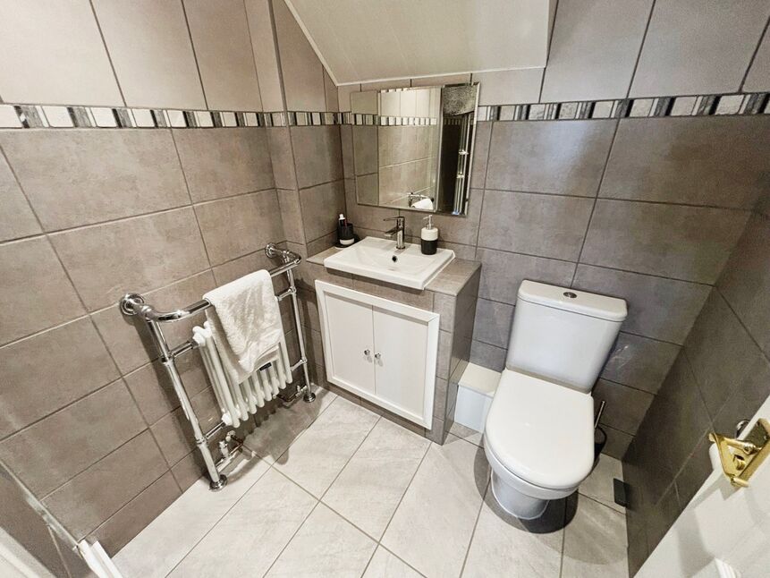 Fitted with a modern three piece suite in white comprising of shower cubicle, wash hand basin and WC. Feature chrome heated towel rail. Tiled flooring Tiled elevations. Inset Spot-lighting.