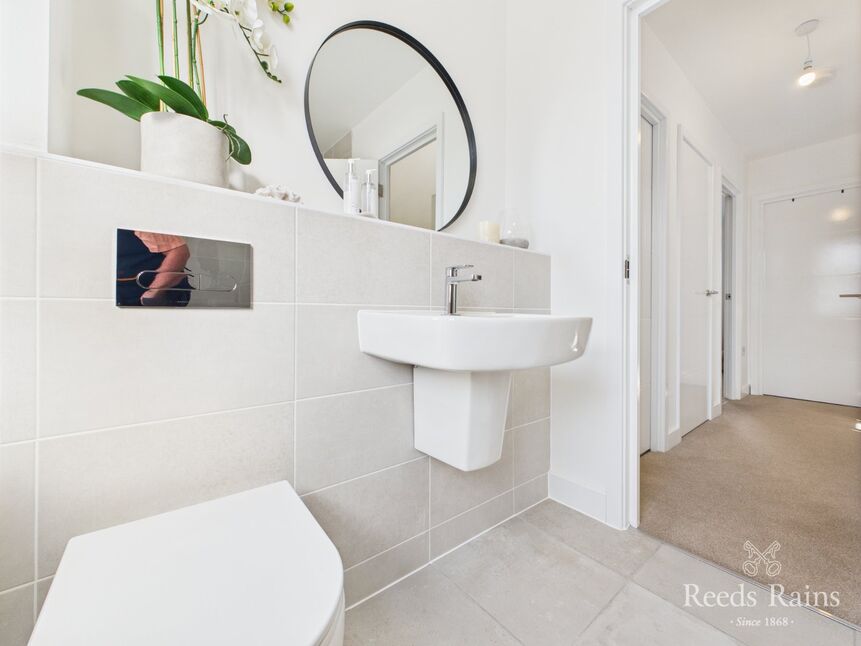 Tucked neatly off the hallway, the ground-floor cloakroom is perfectly practical with a touch of polish. Fitted with a modern two-piece suite comprising wall mounted wash hand basin and low flush WC with a concealed cistern. Finished with contemporary tiling and laminate flooring, it’s ideal for guests and busy family mornings alike.