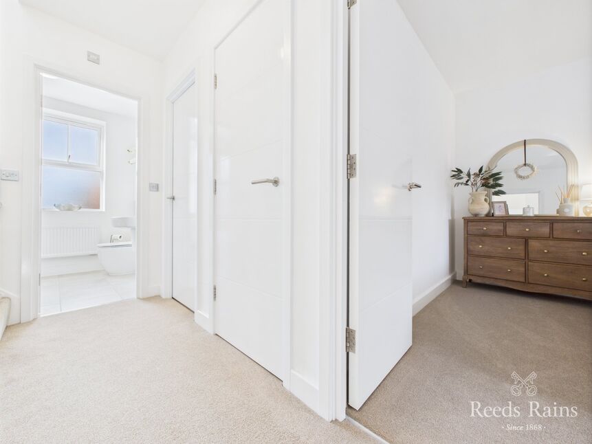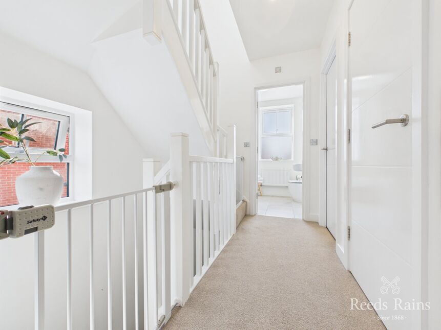 The central landing on the first floor connects three generous bedrooms and the family bathroom. There's plenty of circulation space, adding to the home's light, spacious feel. A side facing window brings in natural light and makes even the landing feel like a room of its own. Built-in airing cupboard. Radiator. Stairs lead off to the second floor.