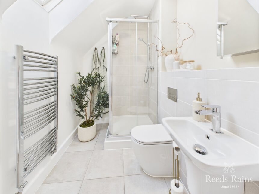 With a rear facing double-glazed Velux style window. The ensuite is beautifully fitted with a modern three-piece suite including walk-in shower enclosure with with a fitted shower unit, low flush WC with a concealed cistern and adjacent wash hand basin. Ceramic wall tiling. Heated towel rail - A hotel-style experience right at home!
