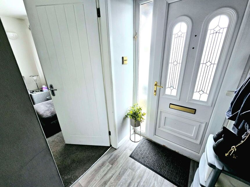 Double glazed obscure UPVC front door and double glazed side panel, stairs to first floor, radiator, laminate flooring, panelled door to:-