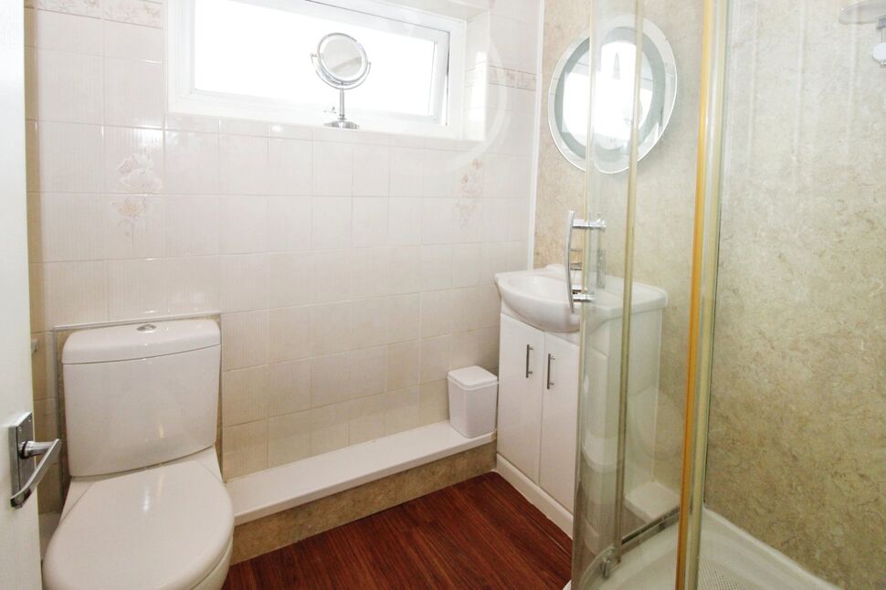 Double glazed obscure window to rear, laminate flooring, part tiled walls and refitted with corner shower cubicle, vanity wash hand basin with storage beneath, WC, radiator.