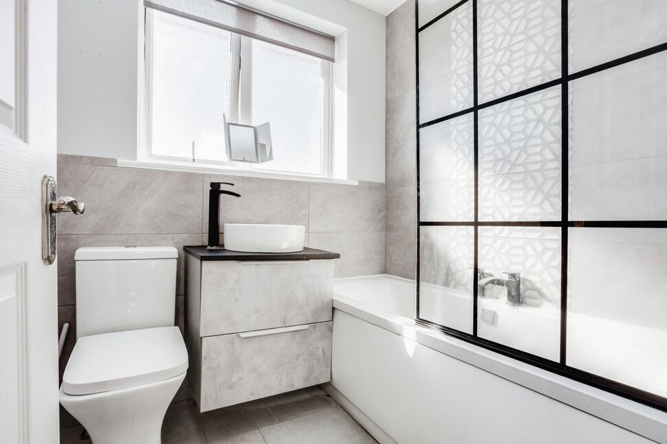 Modern house bathroom with panel bath and thermostatic shower over and glass screen. Vanity wash hand basin and W/C Tiled splash back and tiled flooring