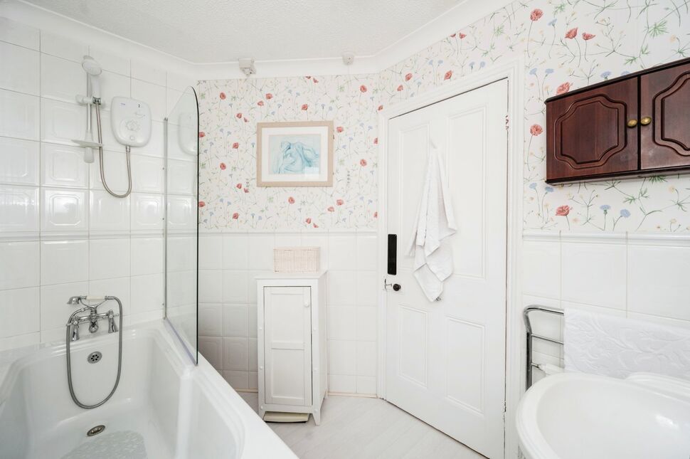 Double glazed window to side, panelled bath with shower over, pedestal wash hand basin, lower level W.C, radiator and part tiled.