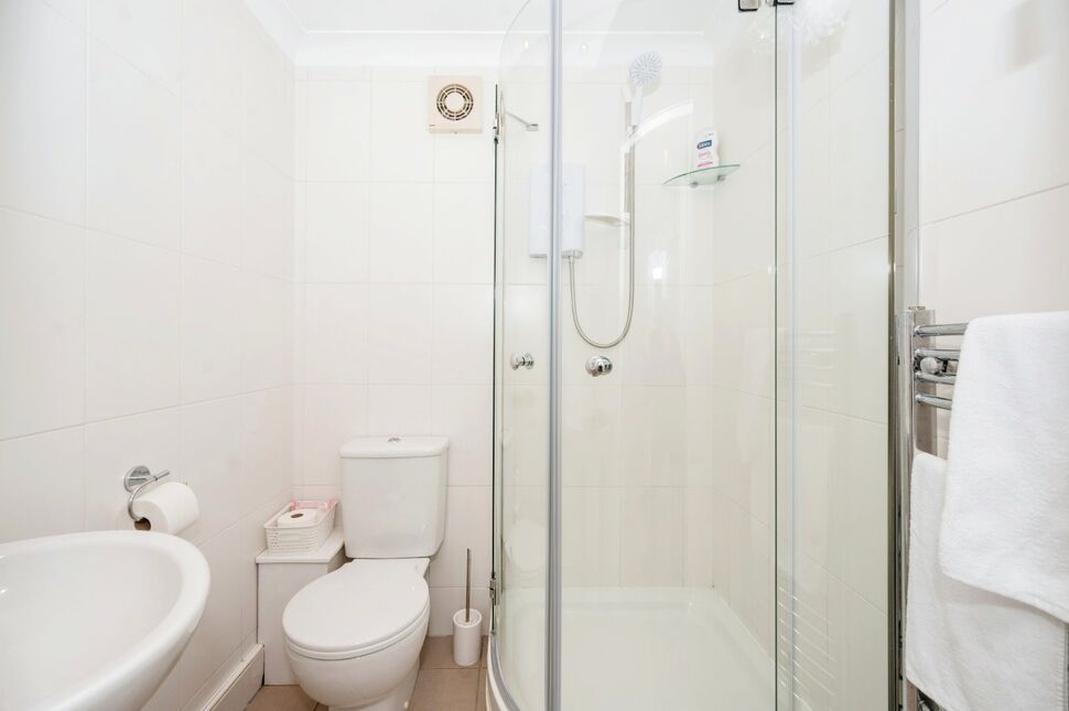 Corner shower unit, pedestal wash hand basin, lower level W.C, radiator and part tiled.