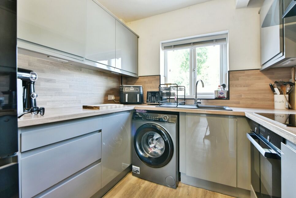 A range of units with integrated hob and oven. Plumbing and space for washing machine. Room for fridge/Freezer. Double glazed window to rear aspect. Door leading to the garden.