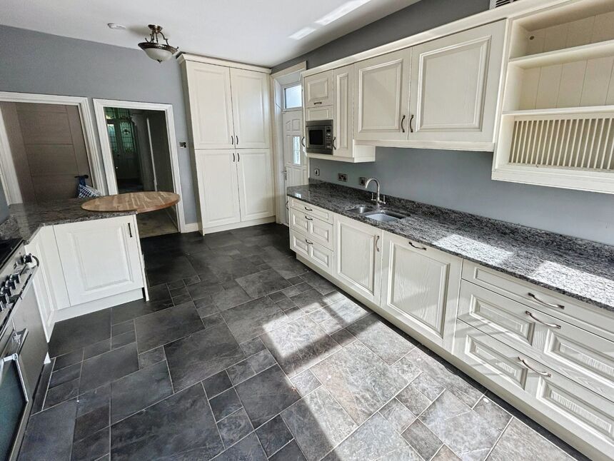 The kitchen diner is fitted with wall and base units with contrasting granite worksurfaces and splashbacks, a sink and drainer, space for American style fridge freezer, breakfast bar, central heating radiator, integral dish washer, separate plumbing, rear facing French doors and also side facing door and door to cellar.