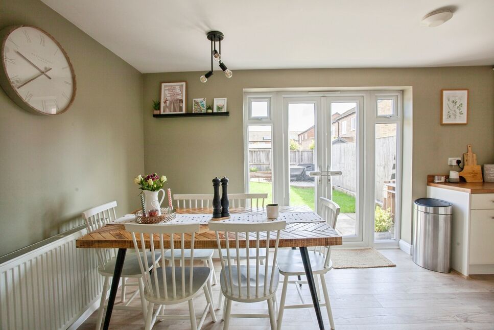 The kitchen diner is fitted with wall and base units with contrasting worksurfaces and tiled splashbacks, a central heating radiator, electric oven and gas hob, central heating boiler, integral washing machine, dish washer and fridge freezer, sink and drainer, storage cupboard and rear facing PVCu double glazed window and French doors.