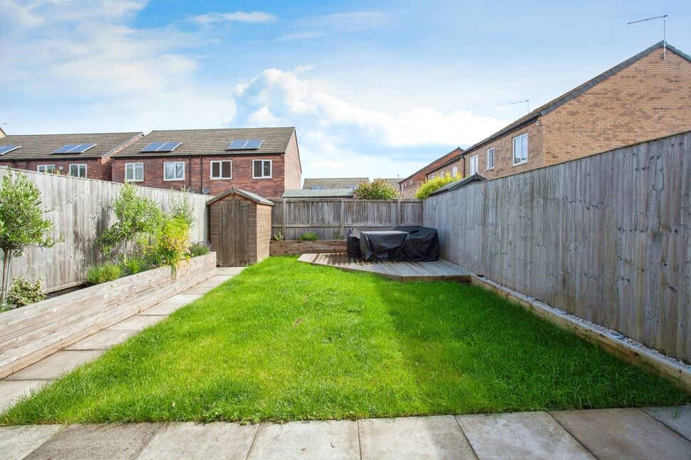 To the front of the property is a lawned area and driveway. To the rear of the property is a landscaped lawn, raised planters, a decked area, shed and gated access to front.