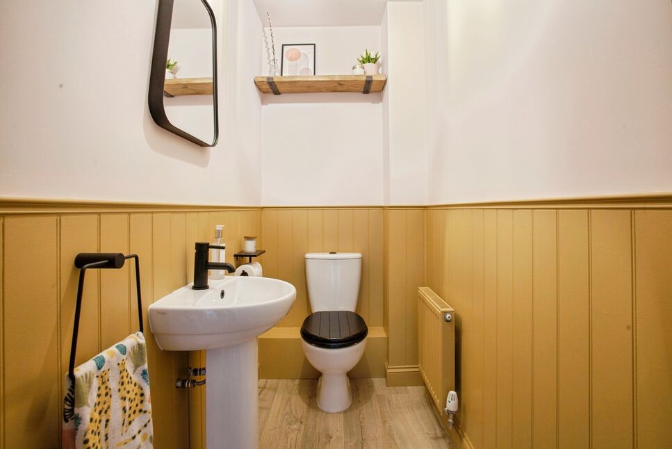 The downstairs toilet is fitted with a wc, wash hand basin, tiled splashbacks and a central heating radiator.