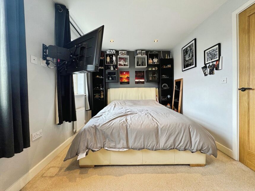 Previously two bedrooms made into creating a bigger bedroom with fitted carpet, two central heating radiators, spotlights to the ceiling and two rear facing double glazed windows.
