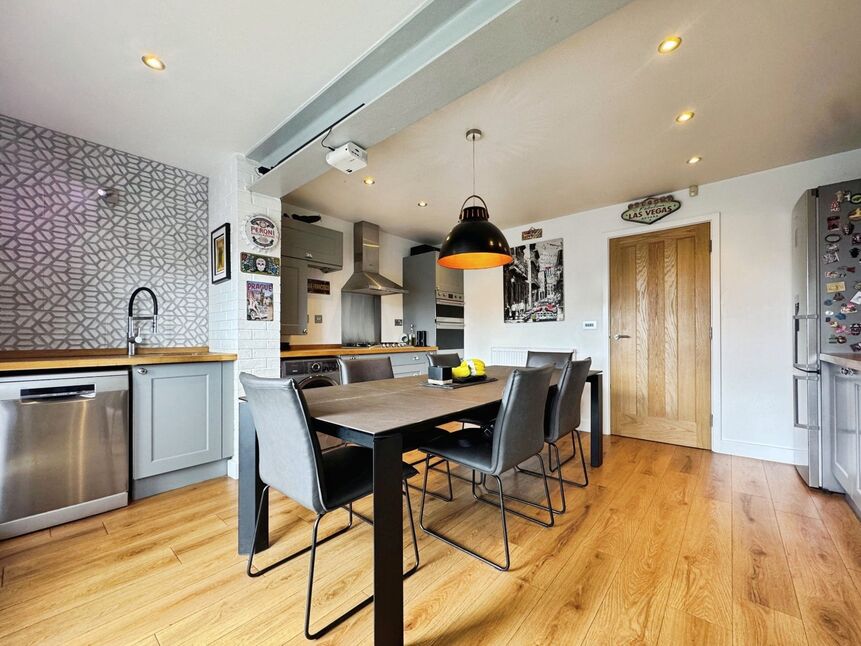 Briefly comprising; an extensive range of matching eye level and base units, inset sink with mixer tap, integrated electric double oven, five ring gas hob with cooker hood over and stainless steel splash back behind, space for a fridge freezer, dishwasher and washing machine, dining space, spotlights to the ceiling, LVT floor covering and sliding patio doors with complimentary fitted blinds providing access to the rear garden.