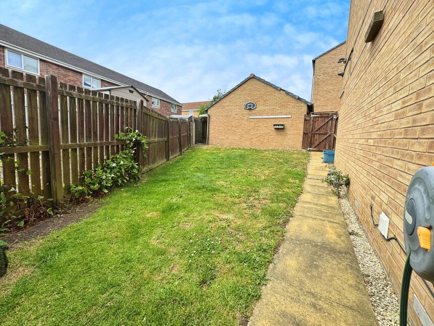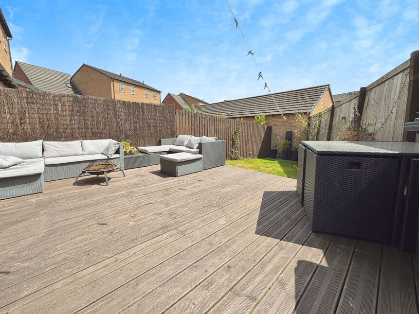 To the front of the property is space for off street parking leading up to the detached garage and gate providing access to the side and rear gardens.To the rear of the property is a lovely South facing garden with large decking area for garden furniture and lawned area which then wraps around to a further lawned garden to side with outside tap and enclosed with fencing.