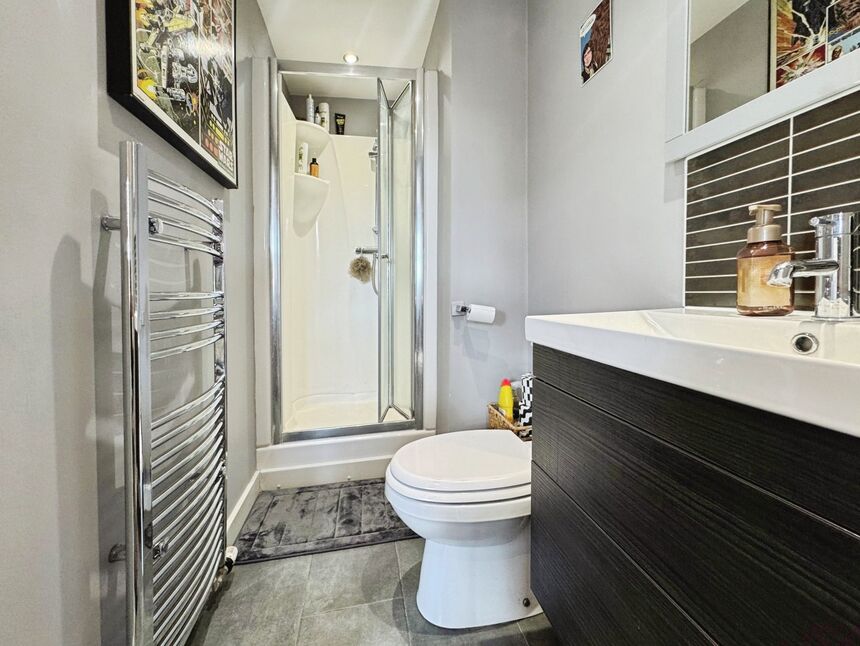 Briefly comprising; shower cubicle, hand wash basin with vanity unit below, W.C, heated towel rail, extractor fan, spotlights to the ceiling and tiled flooring.