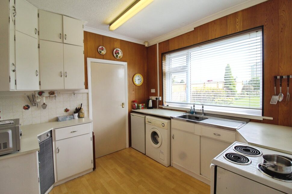 Fitted with a matching range of wall and base units in white, work surfaces with inset chrome sink with drainer, plumbing for a washing machine, part tiled/part wood panelling to elevations, coving to the ceiling, useful under stairs pantry and uPVC double glazed window over looking the rear garden.