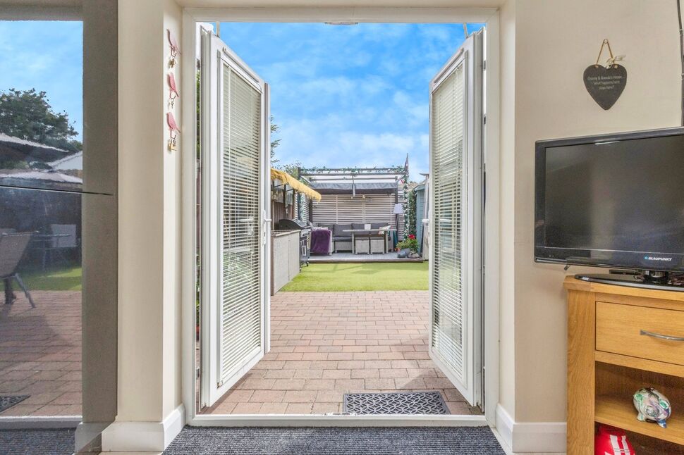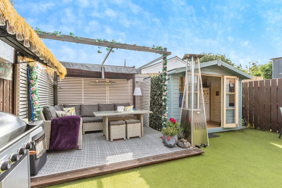 Impressive enclosed rear gardens with outside summer house, decked area. Pergola.