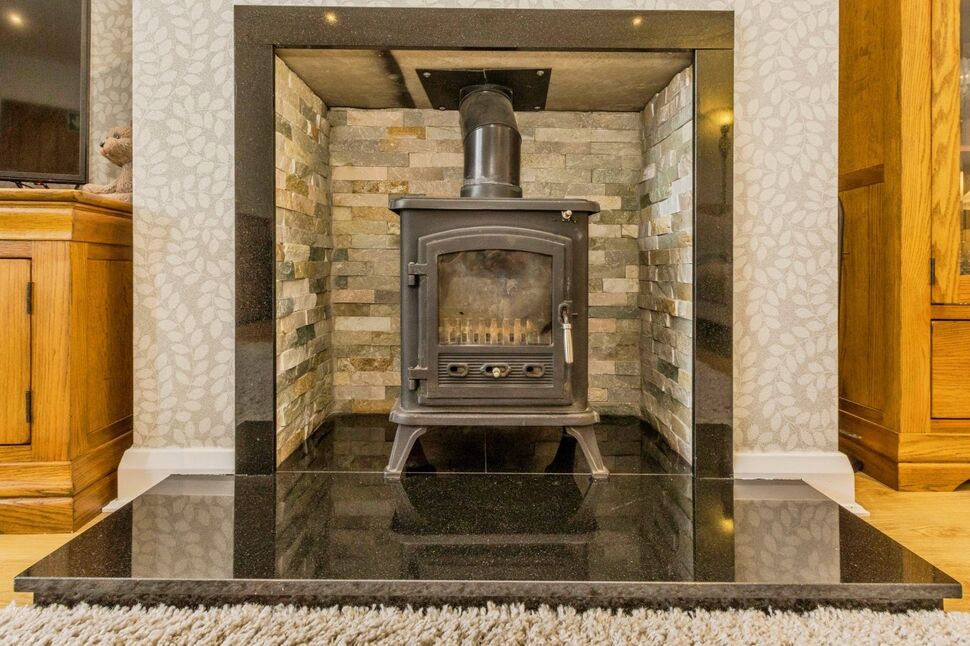 Feature fireplace with stove inset and granite hearth., wooden flooring.