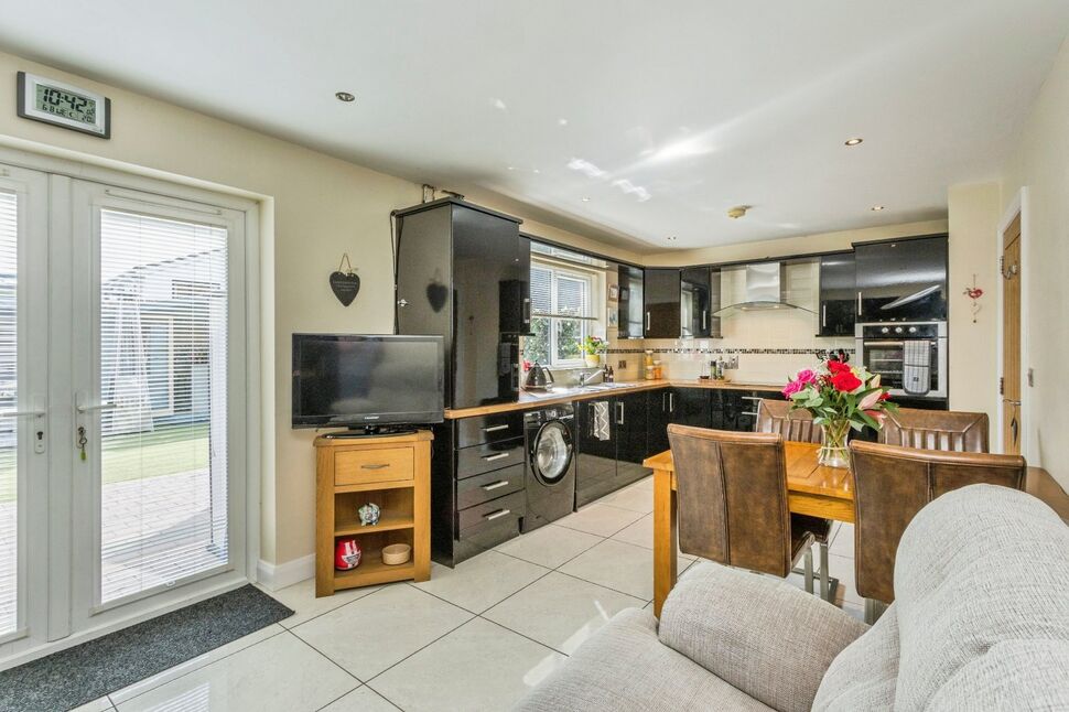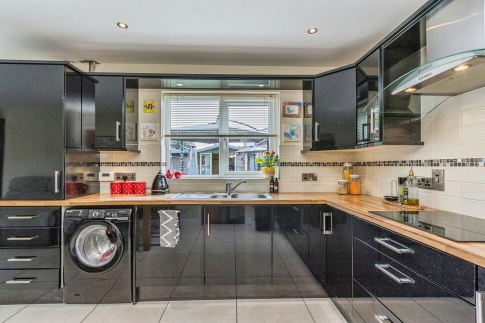 Luxury fitted range of high and low level units, laminate work tops, single drainer stainless teel sink unit, mixer tap, tiled flooring, built-in ceramic hob and electric oven, over head extractor fan, part tiled walls, gas boiler, French doors to rear, plumbed for washing machine