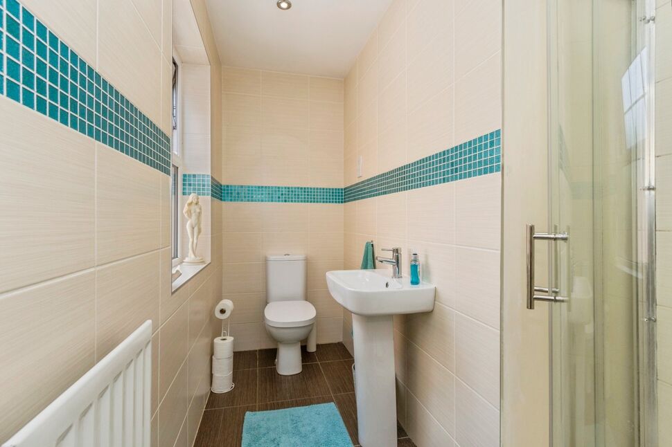 Separate shower cubicle with controlled shower, wash hand basin, low level WC, wall and floor tiling.