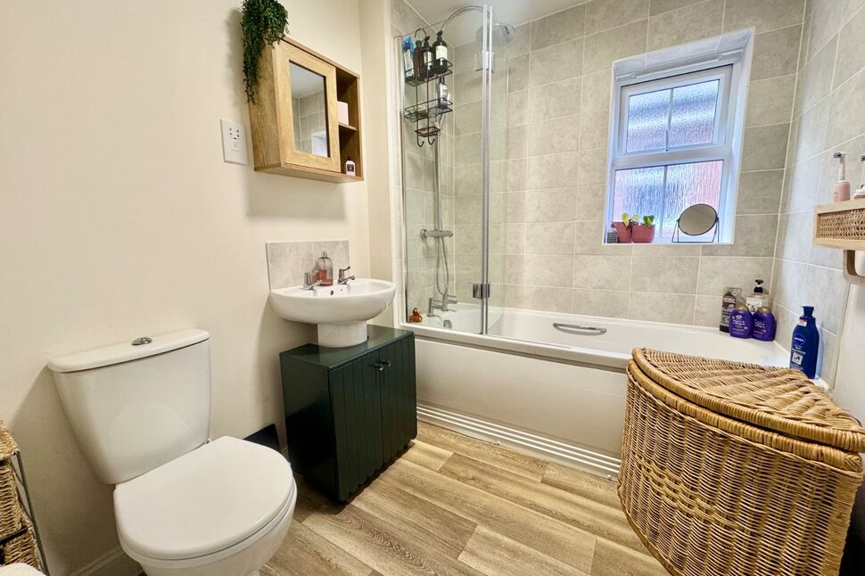 Fitted with panelled bath with shower and waterfall over, wash hand basin and WC. Part tilled walls, window to the side.