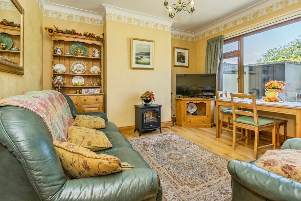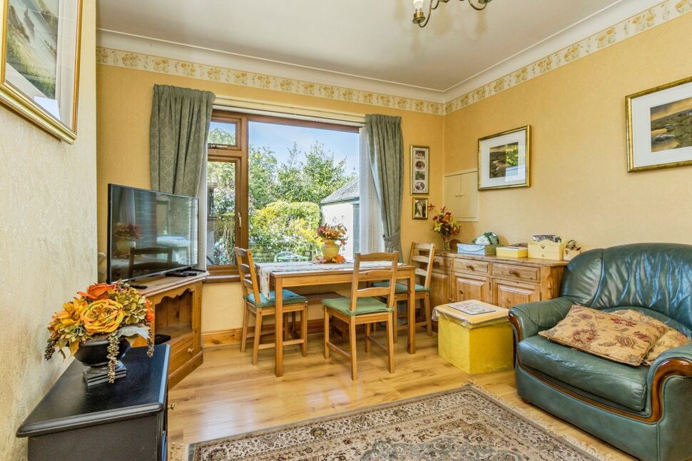 Gas fireplace, slate inset and hearth, laminate wooden floor, cornice ceiling, feature bay window.
