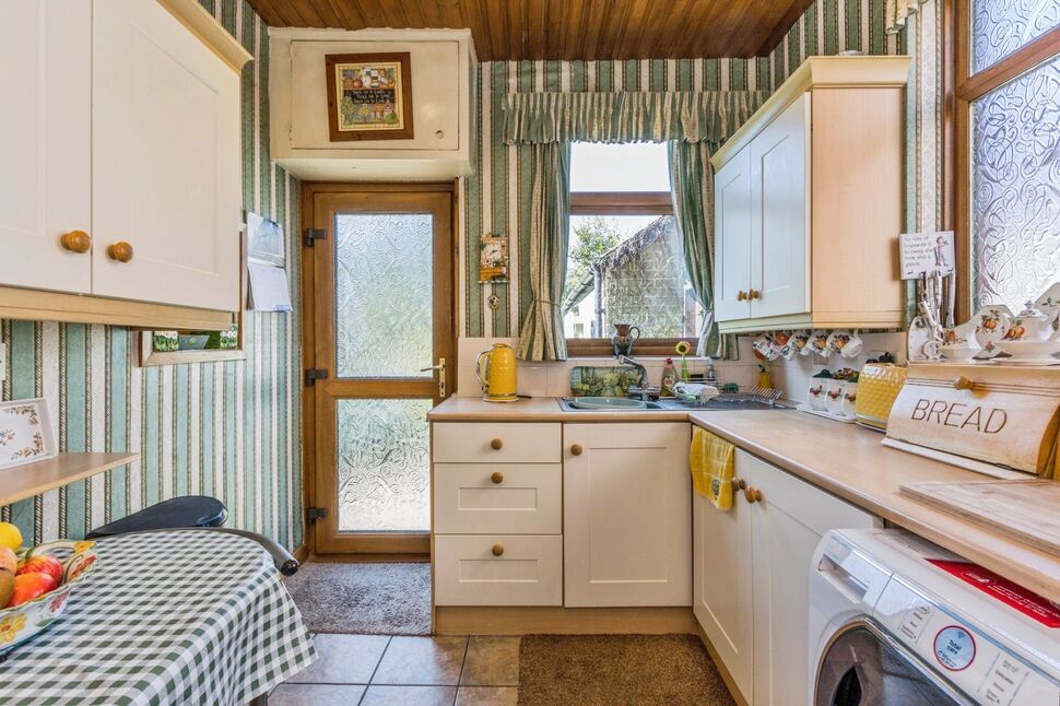 Single drainer stainless steel sink unit with mixer taps, laminate work surfaces, excellent range of high and low level units, cooker space, extractor fan, plumbed for washing machine, casual dining area, ceramic tiled floor, partly tiled walls, tongue and groove ceiling, recessed spotlights, upvc double glazed door to garden.