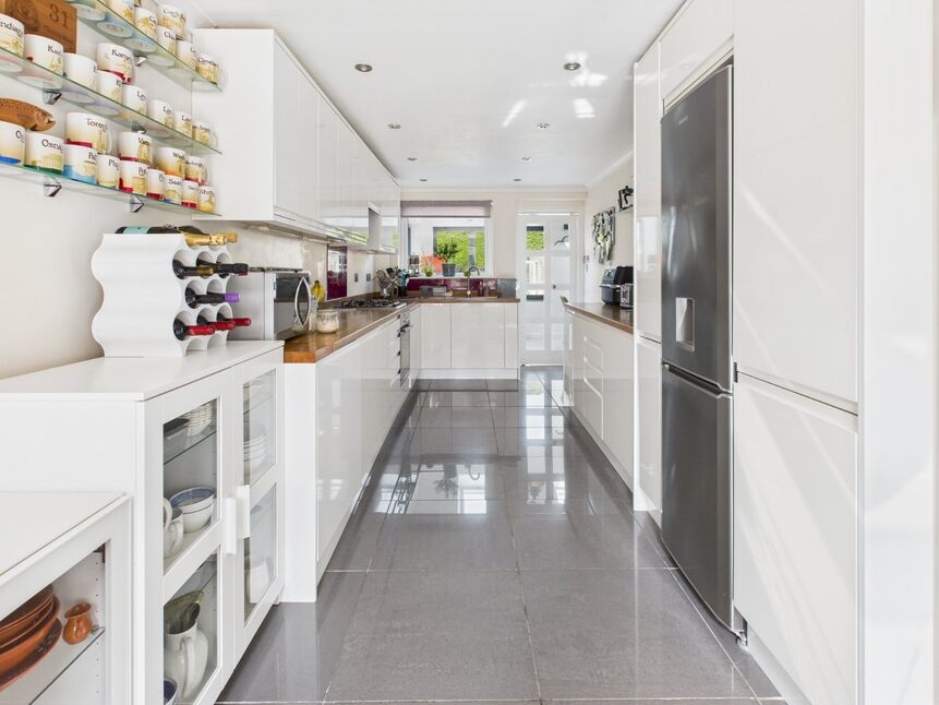 A stylish white gloss kitchen fitted with a range of matching wall and base units with cabinet lighting and worktops over, stainless steel one and a half bowl sink unit with mixer tap. Built in electric oven and gas hob with extractor hood over. Integrated washing machine and dishwasher, space for fridge freezer. Tiled flooring, spot lights, radiator, uPVC double glazed window to front.