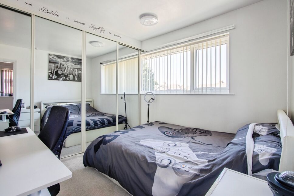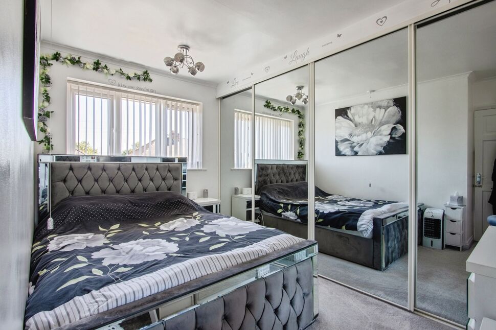 Fitted sliding mirrored wardrobes to one wall, a central heating radiator and a window overlooks the front aspect.