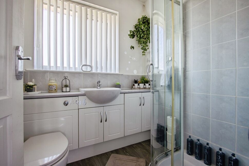 Comprises of a vanity WC and wash basin with a chrome effect mixer tap inset and a shower cubicle with a chrome effect mains shower over. With part tiled walls, a central heating radiator and a window overlooks the rear aspect.