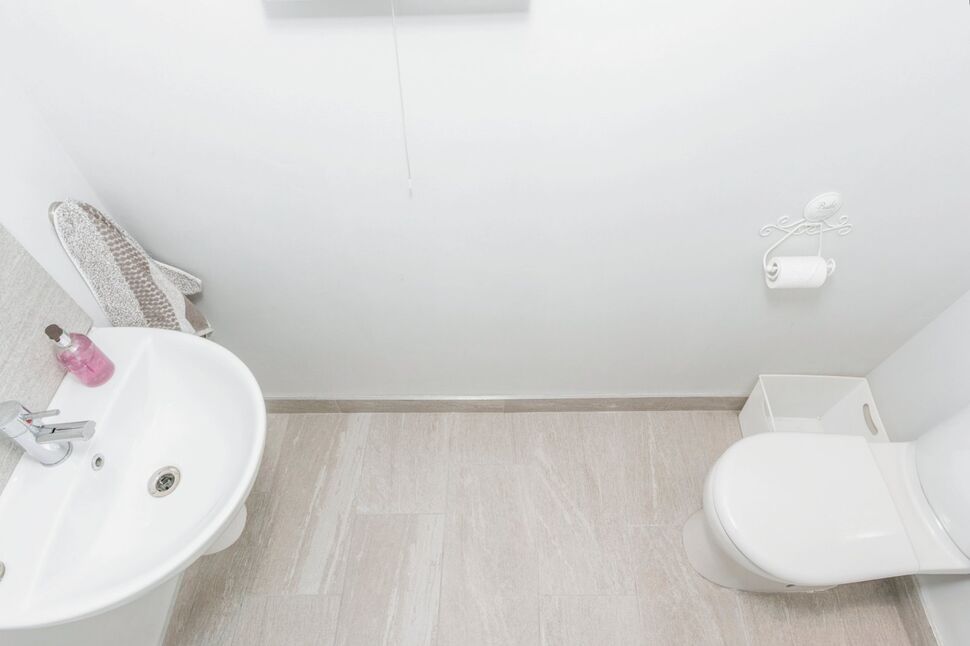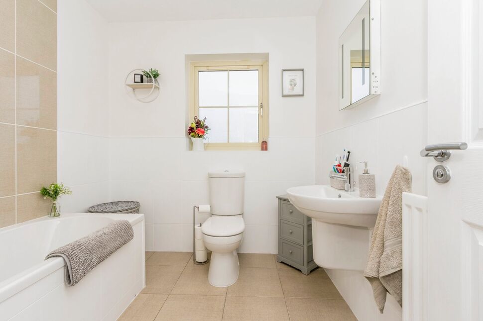 White suite, dual flush wc, semi pedestal wash hand basin with mixer taps, tiled splashback, ceramic tiled floor, extractor fan, recessed spotlight, mirror with lighting.
