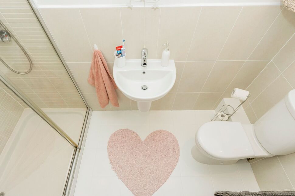Fully tiled built in shower cubicle, thermostatically controlled shower unit, dual flush wc, semi pedestal wash hand basin, ceramic tiled floor, partly tiled walls, extractor fan, recessed spotlights.