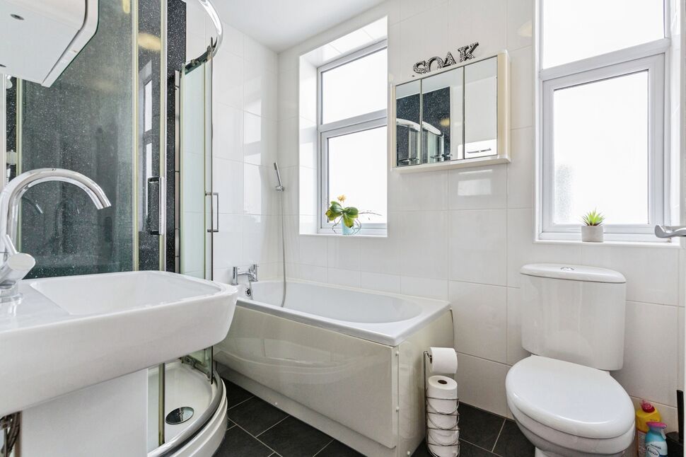 Window to side, ceiling light point, wash hand basin, w/c, shower enclosure with shower, bath, flooring.