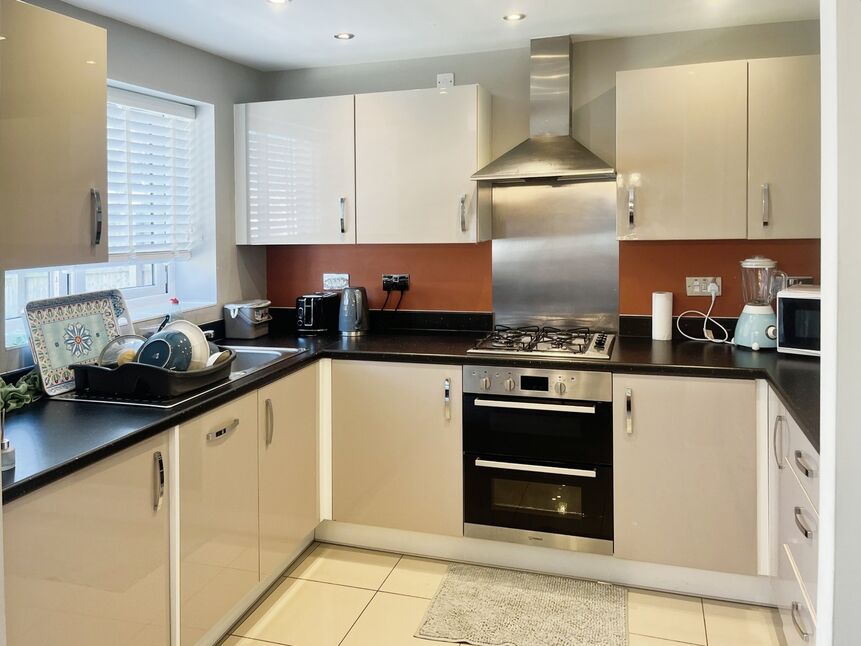 Range of modern wall and base units with complimentary worksurfaces and tiled splashbacks, incorporating a double stainless steel sink unit with mixer tap. Integrated electric oven and gas hob with extractor over. Radiator.