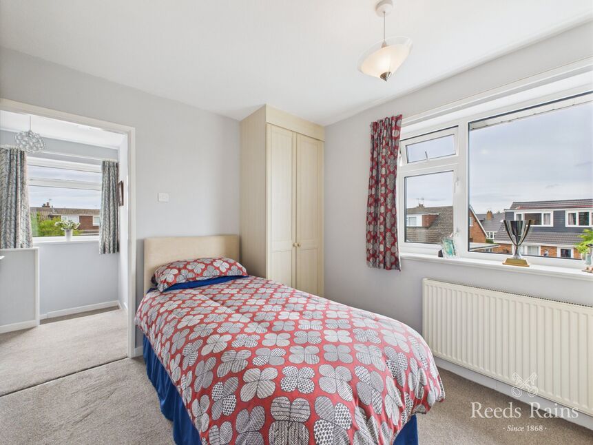 Located at the front of the property, the principal bedroom is bright and generous, with a wide double-glazed window offering a peaceful outlook. Fitted wardrobes span one wall, offering hanging and shelving space. Radiator.